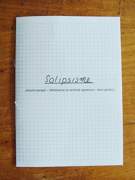 "Conception selon laquelle le moi, avec ses sensations et ses sentiments, constitue la seule réalité existante dont on soit sûr." C'est pourquoi Jean Tardieu a ajouté en guise de didascalie l'indication suivante : "accent parigot - véhémence et certitude agressive - avec gestes"...