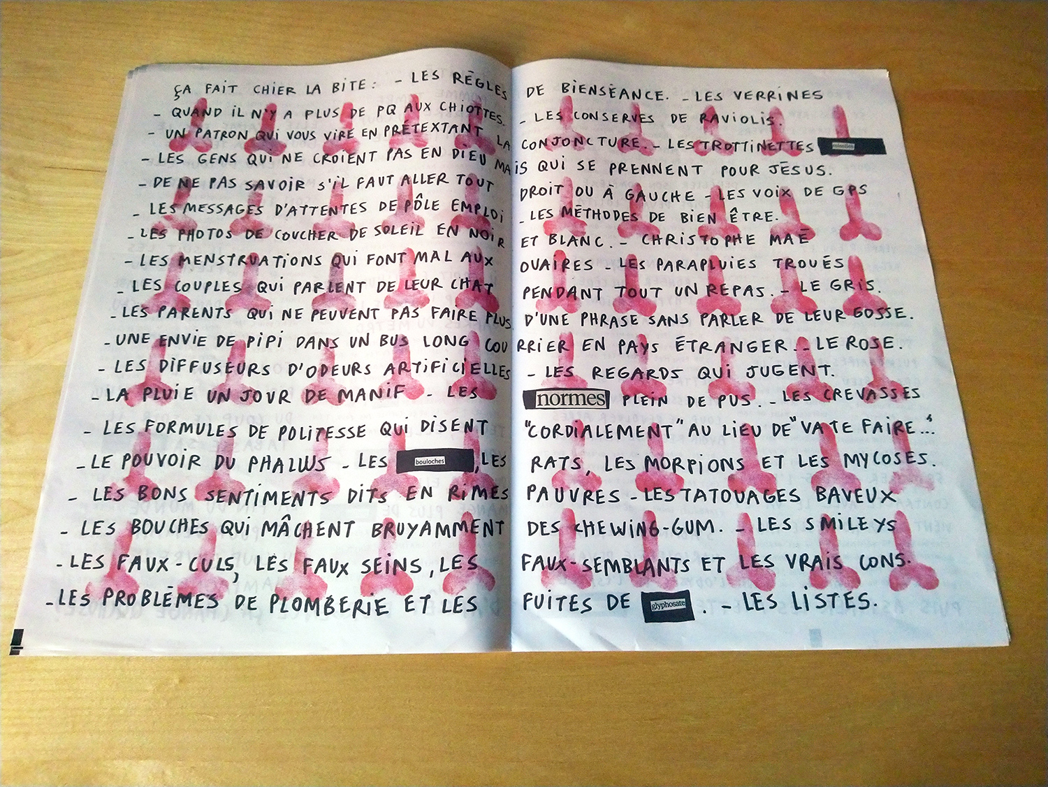 Le rituel de l'artiste consiste chaque matin à s'installer au bistrot et entamer une double page vierge de son journal intime : tirant un fil narratif qui fait se télescoper rêves de la nuit, humour et humeurs, écrivant, raturant, collant, tamponnant, interpellant et questionnant à l'aide de gros titres, en-têtes et autres chapeaux, puis de colonnes serrées pour tout faire tenir sur la page.